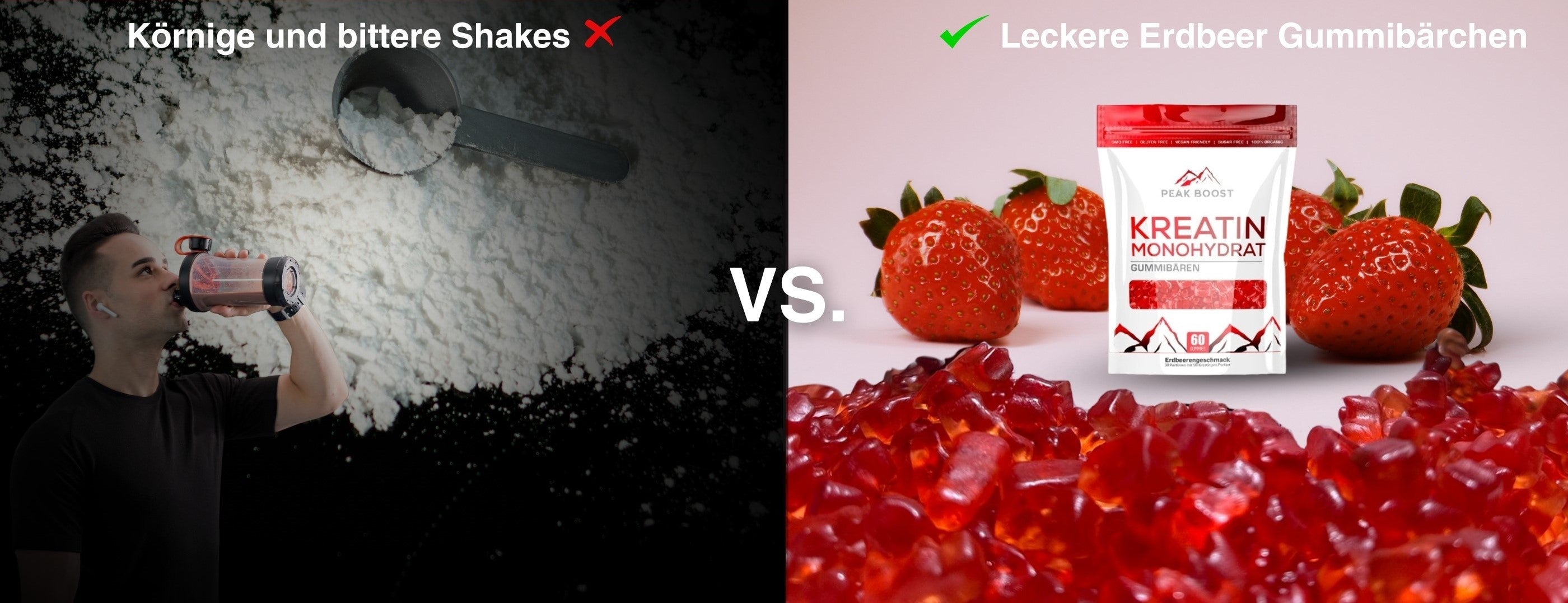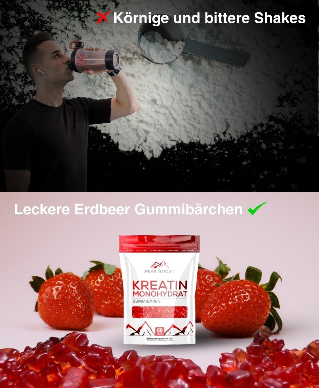 Kreatin-Gummibären und -Pulver sind beide wirksame Formen der Kreatin-Supplementierung. Unsere Gummibären bieten eine bequemere und angenehmere Möglichkeit, Kreatin zu konsumieren, während das Pulver mit einer Flüssigkeit gemischt werden muss. Zudem liefern die Gummibären eine vorab abgemessene Dosis, sodass kein Messlöffel benötigt wird, was sie ideal für die schnelle Einnahme und für unterwegs macht.