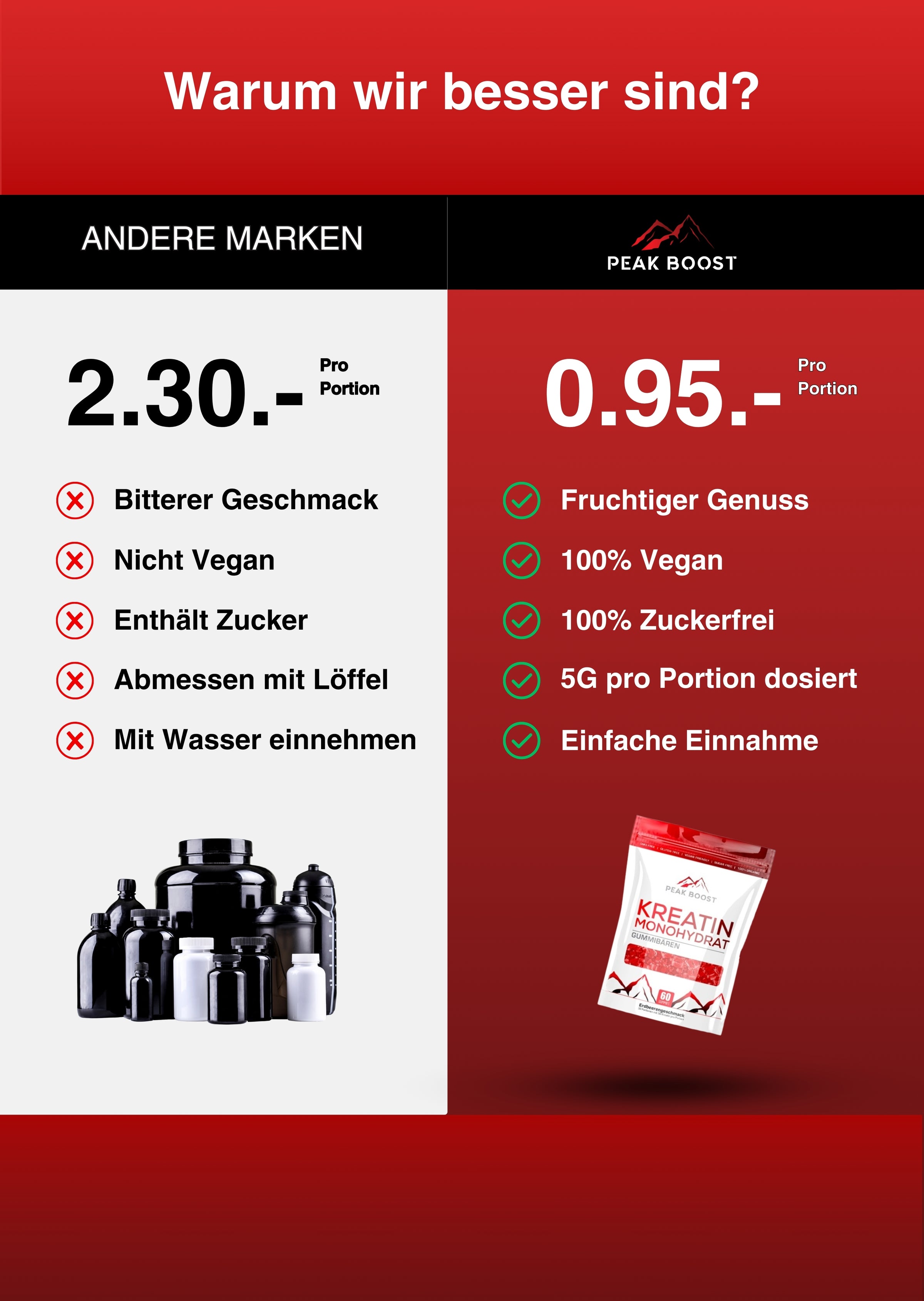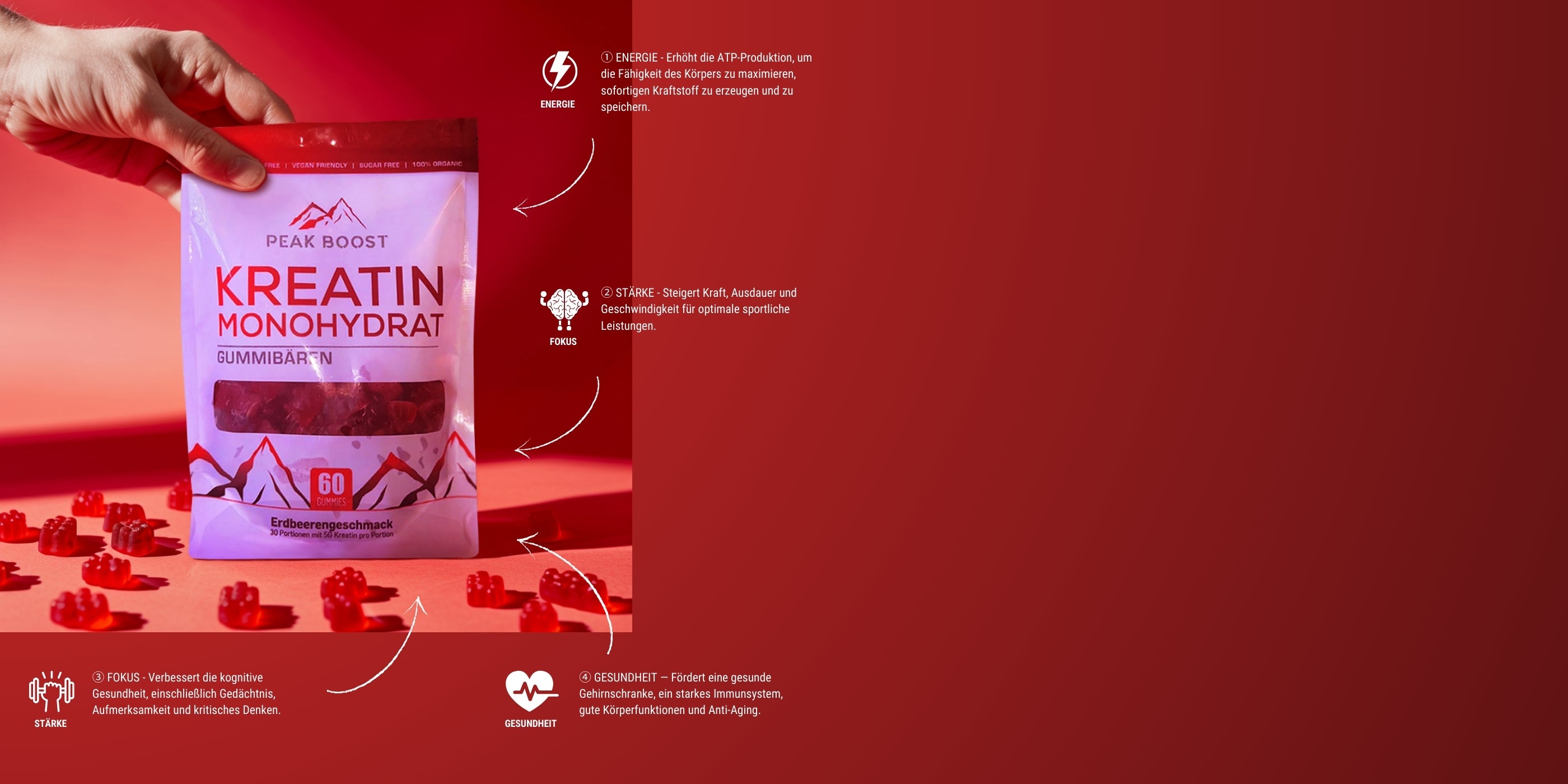 Wir verbesserb das herkömmliche Kreatin und geben dir mit unseren Gummibären eine gesündere alternative. Unsere Gummibären sind: NON-GMO, ZUCKERFREI, GLUTENFREI, VEGAN